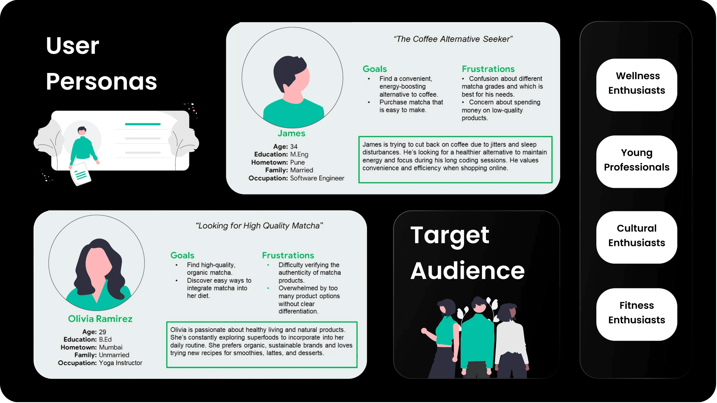 Users visiting matcha websites encounter challenges such as unclear product descriptions, overwhelming navigation, and a lack of engaging content that showcases matcha’s unique cultural and health benefits🌱